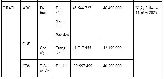 Từ tháng 11 này, LEAD ABS 2026 sẽ chính thức được bán ra thị trường thông qua Hệ thống Cửa hàng Bán xe và Dịch vụ do Honda Ủy nhiệm (HEAD) trên toàn quốc với giá bán lẻ đề xuất như sau: