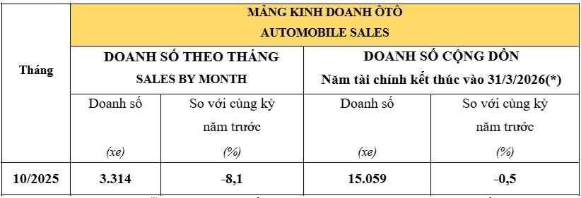 Trong khi đó, ở mảng kinh doanh ô tô, Honda Việt Nam ghi nhận doanh số đạt 3.314 xe, giảm 8,1% so với cùng kỳ tháng 10 năm 2024. Cụ thể: