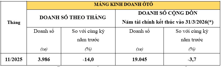 Trong khi đó, ở mảng kinh doanh ô tô, Honda Việt Nam ghi nhận doanh số đạt 3.986 xe, giảm 14,0% so với cùng kỳ tháng 11 năm 2024. Cụ thể: