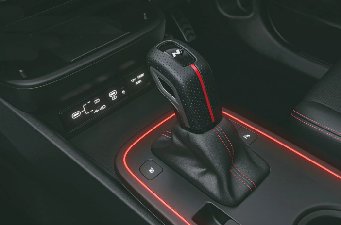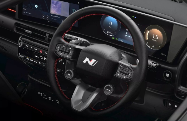Khoang nội thất tiếp tục đi theo tinh thần năng động, Hyundai sử dụng tông đen chủ đạo kết hợp chỉ khâu đỏ tương phản. Xe có vô-lăng ba chấu lấy cảm hứng từ mẫu hiệu suất cao Ioniq 5 N, tích hợp lẫy chuyển số và núm xoay chọn chế độ lái. Logo N xuất hiện trên ghế, cần số và bệ tì tay, trong khi bàn đạp kim loại và hệ thống đèn viền nội thất 64 màu góp phần tăng tính cá nhân hóa cho người lái.