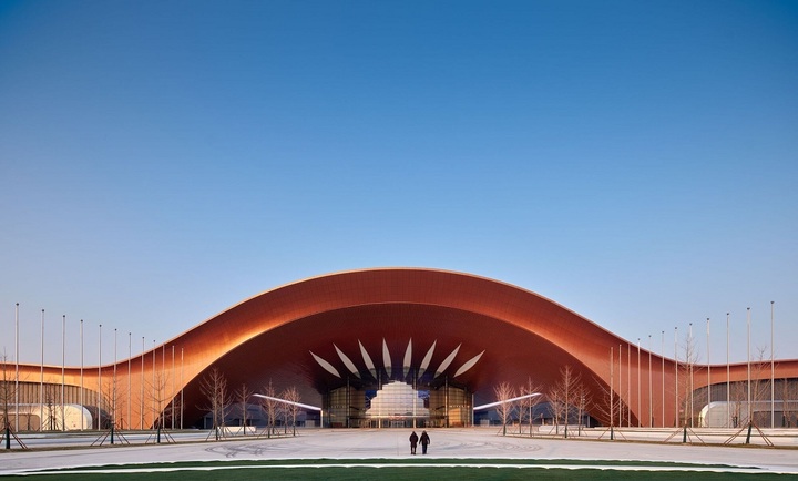 Trung tâm Triển lãm Quốc tế Thủ đô (mái nâu) và Trung tâm Triển lãm Quốc tế Trung Quốc (mái xám bên phải).