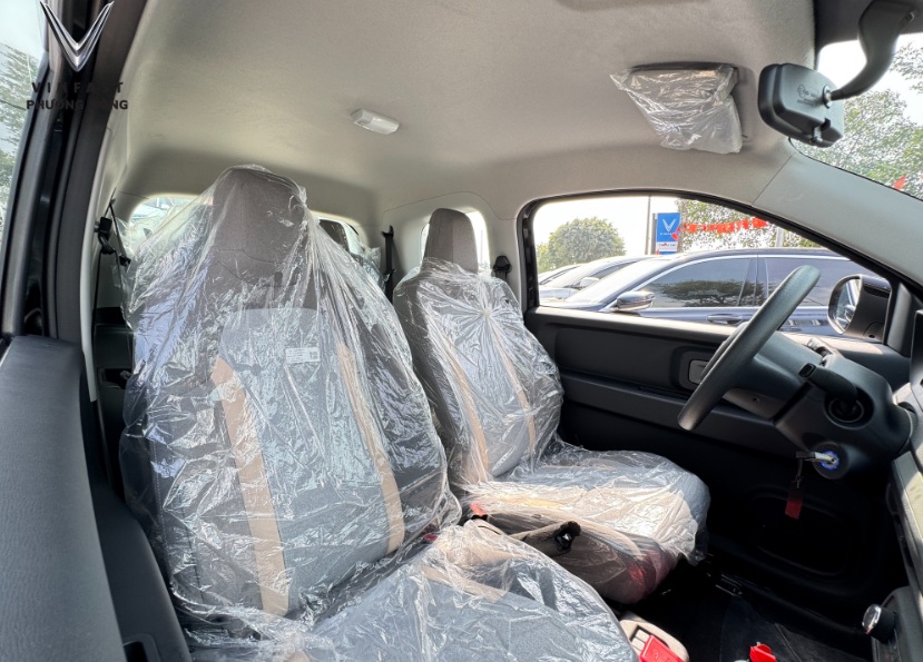 Bên trong cabin, VinFast Minio Green được trang bị ghế bọc nỉ với toàn bộ thao tác chỉnh cơ, tương tự mẫu VF 3 hiện nay. Vô-lăng dạng D-Cut mang thiết kế gọn gàng, tích hợp một số phím chức năng ở bên phải, đi kèm chìa khóa cơ truyền thống.