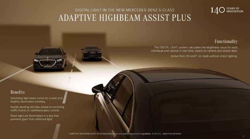Trong điều kiện lý tưởng, hệ thống đèn pha của S-Class mới có khả năng rọi xa tới 605 mét. Tuy nhiên, sức mạnh thuần túy không phải là tất cả. Điểm "thông minh" của Digital Light nằm ở khả năng tương tác với môi trường theo thời gian thực. Dựa trên dữ liệu từ camera và bản đồ định vị, đèn pha có thể tự động xoay và điều chỉnh luồng sáng để tránh gây chói mắt cho người đối diện nhưng vẫn đảm bảo tầm nhìn tối ưu cho tài xế. Tính năng pha bán phần cũng được tinh chỉnh để nhận diện chính xác các chủ thể giao thông trong bóng tối, đảm bảo an toàn tối đa.
