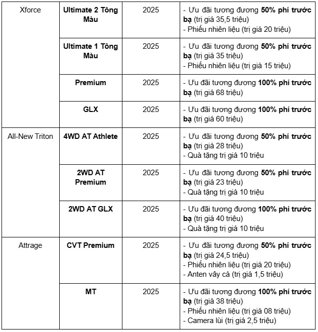 Ở phân khúc SUV cỡ nhỏ, Mitsubishi Xforce cũng được hưởng chính sách ưu đãi hấp dẫn. Hai phiên bản Premium và GLX nhận hỗ trợ tương đương 100% lệ phí trước bạ. Trong khi đó, phiên bản cao cấp Ultimate có gói khuyến mại hơn 55 triệu đồng, bao gồm hỗ trợ 50% phí trước bạ và phiếu nhiên liệu đi kèm.