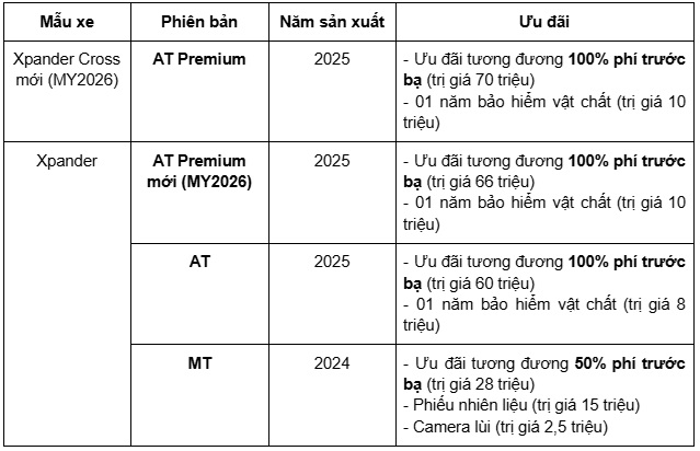 Nổi bật trong số đó là bộ đôi Xpander và Xpander Cross 2026, vừa ra mắt cuối tháng 9 với nhiều nâng cấp đáng giá nhưng giá bán chỉ tăng nhẹ 1 triệu đồng. Khách hàng mua các phiên bản AT sẽ được hỗ trợ tới 100% lệ phí trước bạ, tương đương tối đa 70 triệu đồng, kèm một năm bảo hiểm vật chất. Với bản MT, mức hỗ trợ là 50% phí trước bạ, đồng thời khách hàng còn nhận thêm phiếu nhiên liệu và camera lùi, tổng giá trị ưu đãi vượt 45 triệu đồng.