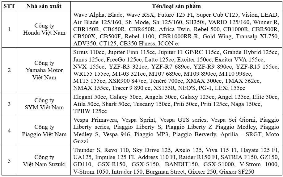 Hiện tại, 5 thành viên VAMM đang cung cấp cho thị trường Việt Nam các dòng sản phẩm đa dạng bao gồm các dòng xe số, xe tay ga, xe tay côn và xe thể thao như sau: