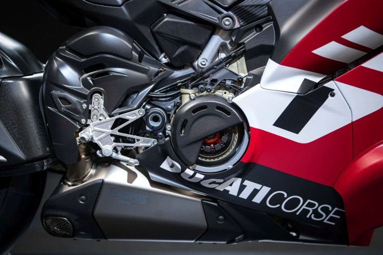 Điểm đặc biệt là mỗi khối động cơ đều được một kỹ sư Ducati canh chỉnh hệ thống trục cam desmodromic thủ công và ký tên xác nhận. Xe sử dụng hộp số đua với số mo (N) nằm dưới số 1 cùng tính năng khóa số mo (DNL) trên tay lái, giúp người lái tránh được việc vô tình mất lực phanh động cơ khi đang thi đấu. Những tinh chỉnh này giúp tỷ lệ công suất trên khối lượng đạt mức kỷ lục 1,48 mã lực/kg khi xe ở cấu hình đua (nặng 167 kg).
