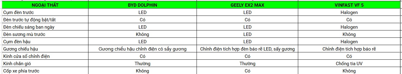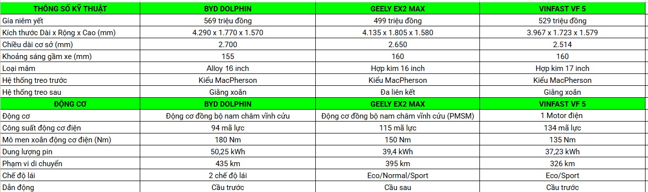 Dưới đây là bảng so sánh thông số kỹ thuật của BYD Dolphin, VinFast VF 5 và Geely EX2: