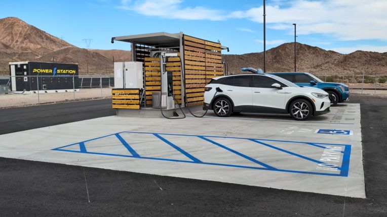 Trạm sạc do PowerStation Charging phát triển vừa đi vào hoạt động tại lối ra Rasor Road trên tuyến cao tốc liên bang I-15, thuộc khu vực Baker, bang California. Điểm khác biệt cốt lõi của cơ sở này nằm ở khả năng hoạt động 24/7 mà không cần kết nối với lưới điện truyền thống. Nguồn điện năng được khai thác từ hệ thống 1.080 tấm pin mặt trời, đạt công suất tối đa 640kW. Toàn bộ lượng điện thu được sẽ nạp vào bộ pin lưu trữ có dung lượng lên tới 3,4MWh, đảm bảo duy trì hoạt động ổn định cho trạm ngay cả khi điều kiện thời tiết không có ánh nắng.