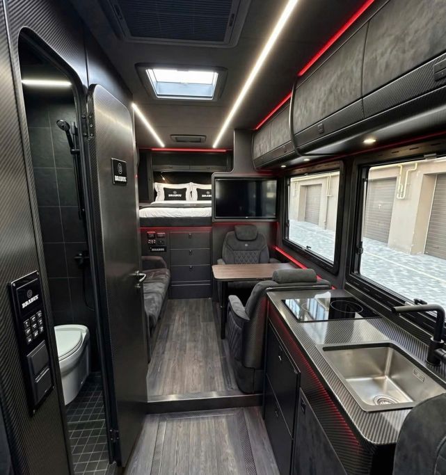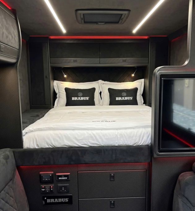 Theo các hình ảnh được công bố, khoang nội thất của chiếc xe mang phong cách sang trọng với chất liệu Alcantara đen và sợi carbon bao phủ khắp nơi, từ cửa nhà vệ sinh đến bệ bếp. Không gian bên trong được mô phỏng vô cùng rộng rãi, vượt xa kích thước thực tế của dòng G-Class.