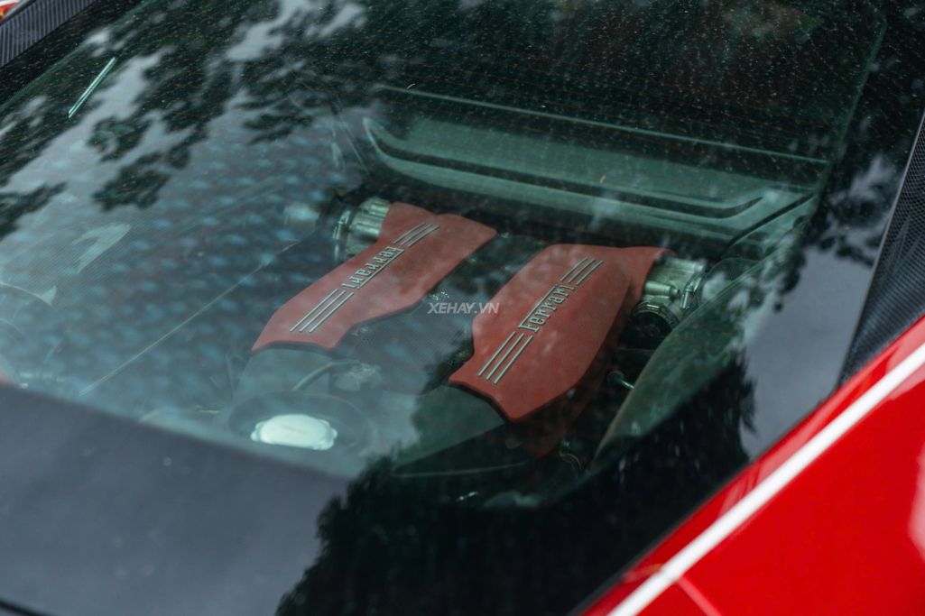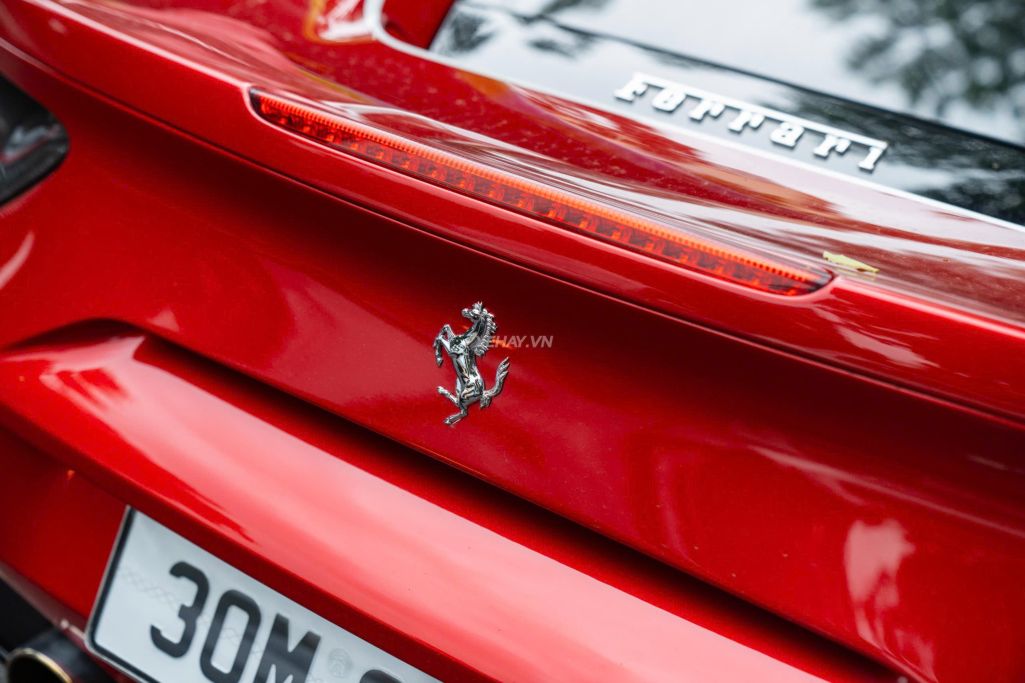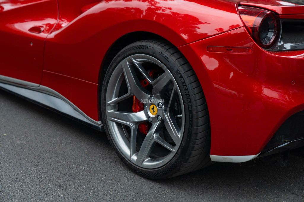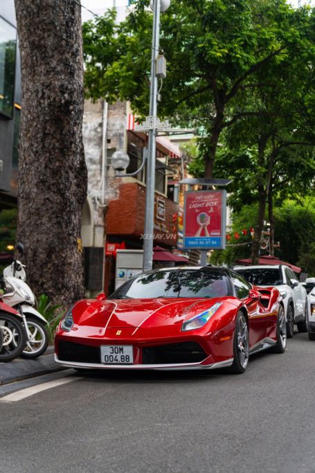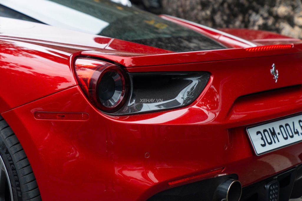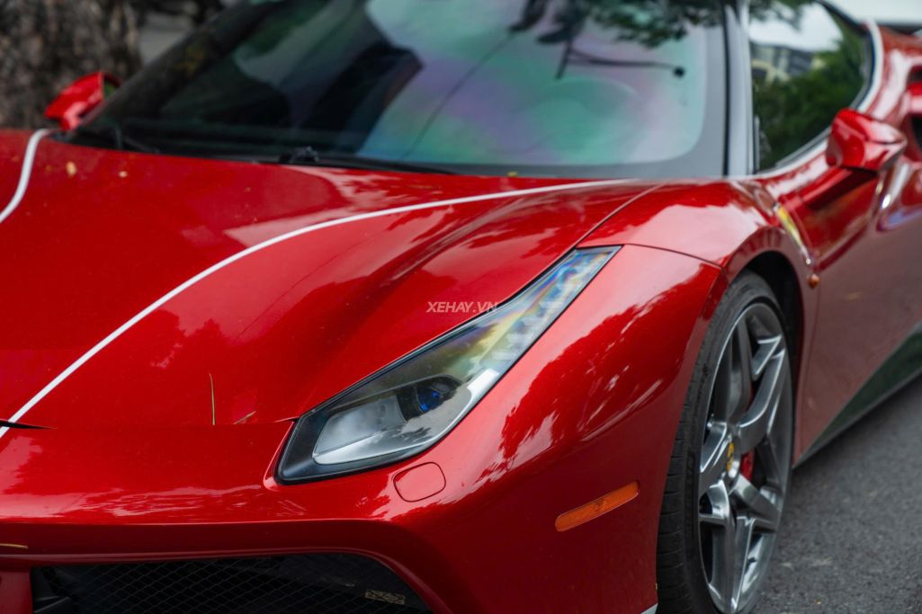 Khi mới về nước, chiếc Ferrari 488 GTB mang màu đỏ Rosso Corsa truyền thống - sắc đỏ biểu tượng gắn liền với thương hiệu “ngựa chồm” của Ý. Tuy nhiên, đến nay, chiếc xe đã được làm mới với tông đỏ đô đậm hơn, kết hợp mui đen, sọc kép màu trắng chạy dọc thân và cản trước được ốp sợi carbon. Đặc biệt, nắp ca-pô cũng xuất hiện đường chỉ trắng, mang đến phong cách thể thao và khác biệt so với nguyên bản.
