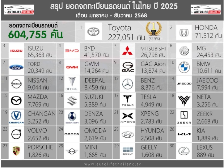Xét theo doanh số tuyệt đối, VinFast dẫn đầu cả mảng xe điện lẫn toàn ngành. Toyota xếp thứ hai và tiếp tục là hãng bán nhiều xe động cơ đốt trong nhất tại Việt Nam, với gần 72.000 xe trong năm 2025.