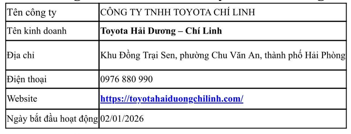 Theo đó, Toyota Hải Dương – Chí Linh có địa chỉ tại Khu Đồng Trại Sen, Phường Chu Văn An, Thành phố Hải Phòng, sẽ chính thức đi vào hoạt động từ ngày 2/1/2026, đưa tổng số Đại lý/Chi nhánh đại lý và Trạm uỷ quyền của Toyota lên con số 87.