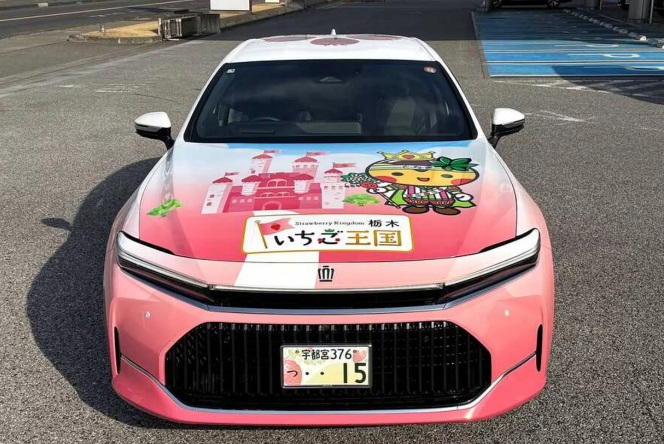 Thay vì sắc đen hoặc xám truyền thống, mẫu sedan cỡ lớn này được phủ lớp áo hồng rực rỡ, lấy cảm hứng trực tiếp từ dâu tây - loại nông sản nổi tiếng của tỉnh Tochigi, Nhật Bản.