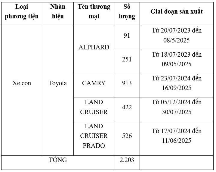 Chương trình sẽ được Toyota Việt Nam thực hiện chính thức từ ngày 30/12/2025 tại tất cả các Đại lý Toyota trên toàn quốc. Danh sách và số lượng xe tại Việt Nam bị ảnh hưởng cụ thể như sau: