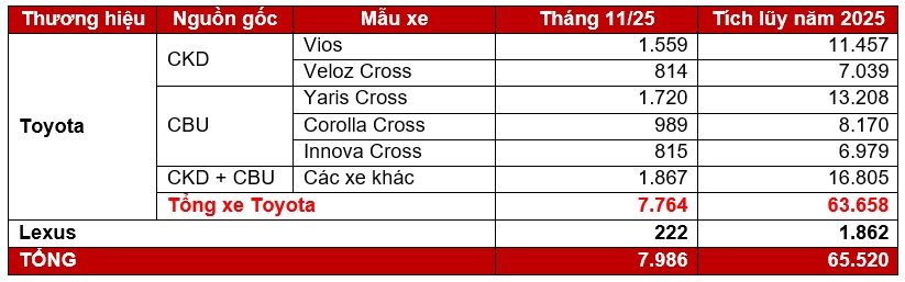 Cụ thể, doanh số toàn quốc của các mẫu xe Toyota đạt 7.764 xe, bao gồm 2.628 xe lắp ráp trong nước và 5.136 xe nhập khẩu nguyên chiếc và nâng tổng doanh số tích lũy năm 2025 tăng 10% so với cùng kỳ năm ngoái.