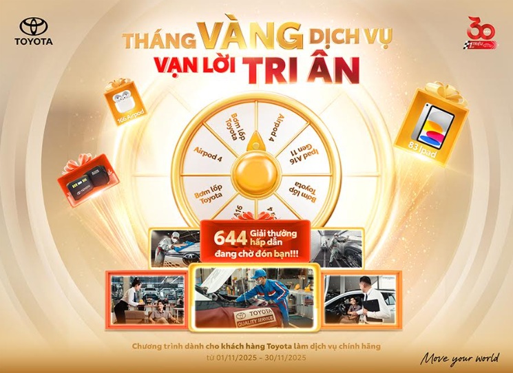 Cụ thể, từ ngày 01/11 – 31/11/2025, các khách hàng tới sử dụng dịch vụ tại hệ thống Đại lý và trạm dịch vụ ủy quyền của Toyota Việt Nam sẽ được bốc thăm quay số trúng thưởng: