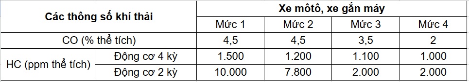 Nhóm xe gắn máy (dung tích xi-lanh dưới 50cm3): Tiêu chuẩn dành cho loại hình này có phần nới lỏng hơn về thời gian nhưng vẫn đảm bảo sự nghiêm ngặt. Xe sản xuất trước năm 2016 áp dụng Mức 1; xe sản xuất từ năm 2017 đến giữa năm 2027 áp dụng Mức 2. Các dòng xe gắn máy mới từ tháng 7/2027 trở đi đều phải đạt tiêu chuẩn khí thải Mức 4.