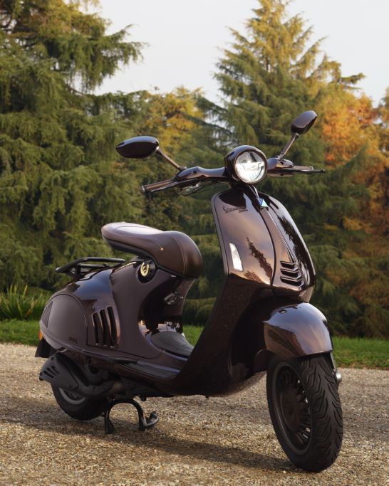 Vespa 946 Horse nổi bật với sắc nâu trầm sâu lắng, gợi nhớ đến bộ lông sẫm bóng và uyển chuyển của loài ngựa. Thân xe bằng thép được tái định nghĩa qua sự đối lập đầy nghệ thuật giữa bề mặt mờ và bóng, kết hợp cùng các chi tiết mạ vàng tinh xảo, trong đó nổi bật là logo chữ V được dập tinh tế tại trung tâm hình móng ngựa bên dưới yên xe.