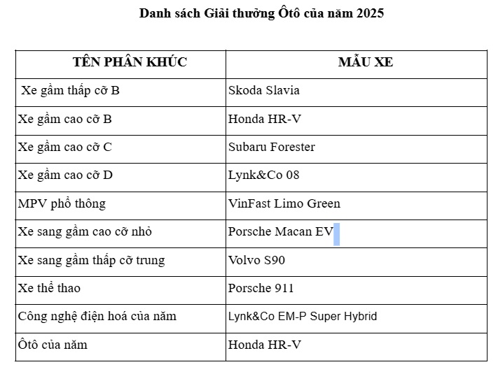 Ở các hạng mục “Ô tô của năm theo từng phân khúc”, Skoda Slavia được vinh danh ở phân khúc xe gầm thấp cỡ B; Honda HR-V tiếp tục giành giải ở phân khúc crossover cỡ B; Subaru Forester dẫn đầu phân khúc crossover cỡ C; Lynk & Co 08 chiến thắng ở phân khúc SUV/crossover cỡ D; trong khi VinFast Limo Green được lựa chọn là mẫu MPV phổ thông tiêu biểu. Ở nhóm xe sang, Porsche Macan EV giành giải ở phân khúc gầm cao cỡ nhỏ, Volvo S90 được vinh danh ở phân khúc gầm thấp cỡ trung và Porsche 911 nhận danh hiệu “Xe thể thao của năm”.