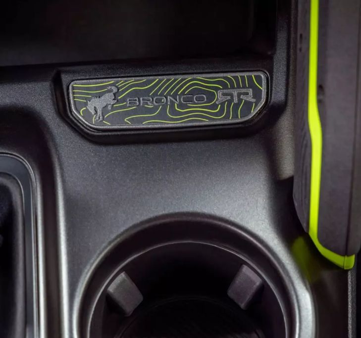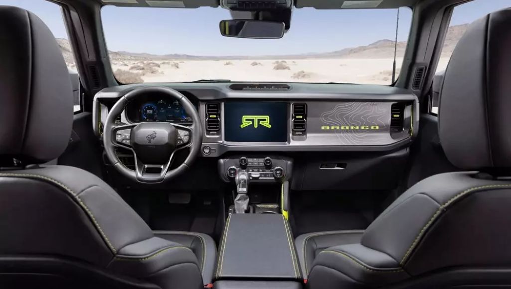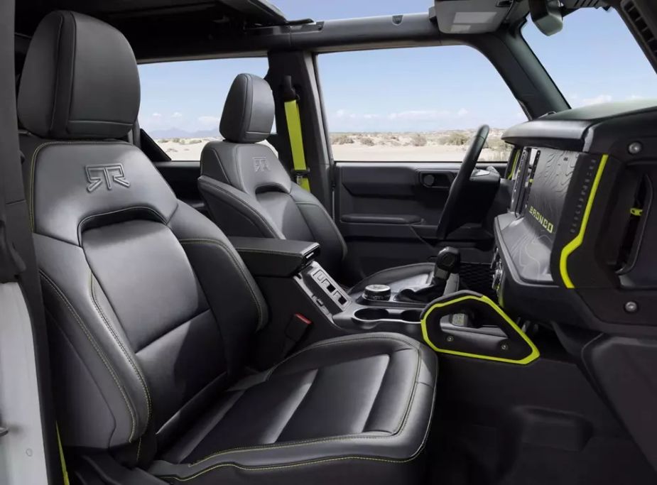 Điểm khác biệt lớn nhất của Ford Bronco RTR so với các phiên bản tiêu chuẩn nằm ở khoang cabin được phối màu theo phong cách thể thao. Các nhà thiết kế đã sử dụng tông màu vàng chanh Hyper Lime làm điểm nhấn chủ đạo trên nền da đen, xuất hiện tại các vị trí như ốp mặt táp-lô, tay nắm cửa và dây đai an toàn.